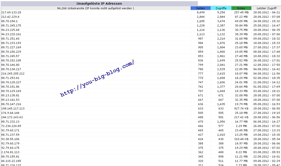 Dort siehst du von welche Unbekannte IP Adresse, bot, spider oder robot, wie viele Seiten, Zugriffe (Connects) , Bytes (traffic) , Datum usw.